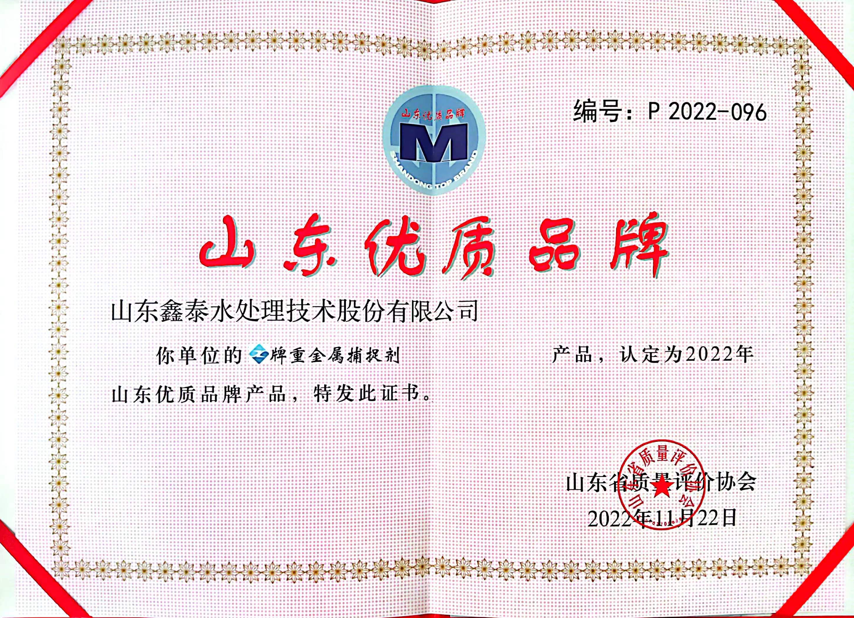 近日,山東省質量評價協會公布了2022年山東優質品牌產品認定結果,山東鑫泰水處理技術股份有限公司生產產品“重金屬捕捉劑”入選“2022年山東優質品牌產品”。